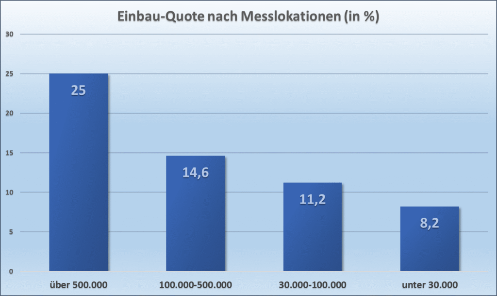 Die im Mittel erreichte 20-Prozent-Quote kaschiert erhebliche Unterschiede zwischen den Messstellenbetreibern. Die Bundesnetzagentur unterscheidet nach Größenklassen, gemessen an der Anzahl der Messlokationen pro Unternehmen. Bei den 18 größten Messstellenbetreibern mit jeweils mehr als 500.000 Messlokationen liegt die Einbauquote für Pflichteinbaufälle im Schnitt bereits bei 25 Prozent. In der Gruppe der 67 Betreiber mit 100.000 bis 500.000 Messstellen beträgt der Durchschnitt 14,6 Prozent, bei 129 Unternehmen mit 30.000 bis 100.000 Messlokationen noch 11,2 Prozent.