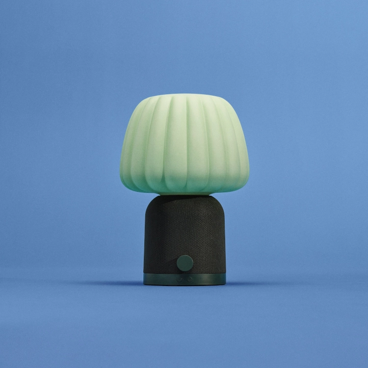 Kulglass geht noch einen Schritt weiter in Richtung Wohnobjekt. Hier steckt der Lautsprecher im Fuß, oben sitzt eine Glaslampe, deren gedrehter Schirm deutlich an Softeis erinnert. Die Farbkombinationen bewegen sich zwischen Grün-, Rot- und Rosatönen – klar als Statement-Piece gedacht und nicht als unauffällige Ecke-Beschallung.
